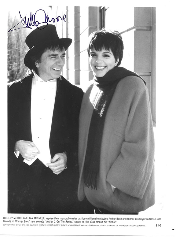 MOORE, Dudley (1935-2002). English actor, comedian, musician and composer. Warner Bros, B&W photograph of Moore smiling and standing next to Lisa Minnelli from the movie “Arthur 2 On The Rocks.” Signed by Dudley Moore. In fine condition...........$135.00 |