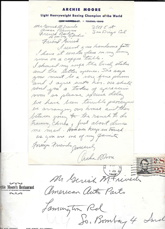 MOORE, Archie (1916-1998). World Light-Heavyweight Champion (1952-1960). He holds the record for the most KO’s (145). Inducted into the Boxing Hall of Fame. Wonderful content handwritten letter with original envelope postmarked July 3, 1964. To a collector in Bombay, India. Moore writes in part: “ I received your handsome foto I have it under glass in my living room... I showed my wife the lovely statue and the letter opener. She says you must be a very fine person and I agree with her. We shall send you a token of appreciation soon... we have been terrible preoccupied in arranging our house and then between going to the ranch to do training chores, just about drives me mad... ”