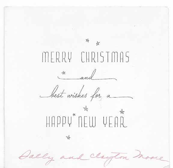 MOORE, Clayton (1914-1999). Actor who entered the show business as a young circus acrobat. He reached stardom on the television series as “The Lone Ranger” (1949-1957). Very vintage photograph dated before his appearance as “The Lone Ranger.” Photograph, 4”x5”, three quarter length pose, leaning on a fence, dressed in a suit and hat and smiling. A very handsome pose. Inscribed in fountain pen: “To Vernon, The Very Best of luck, Clayton Moore, 1948.” This is the earliest pose of Moore we have handled and it is in fine condition Together with a vintage Christmas Card from Sally and Clayton Moore, signed by her hand........$125.00