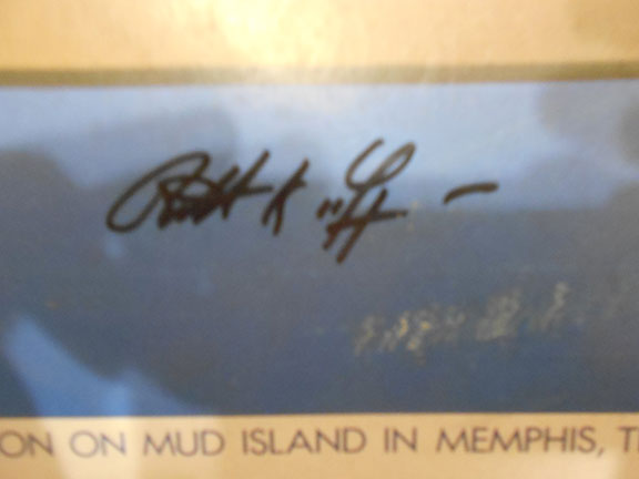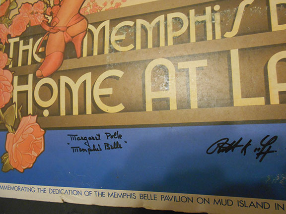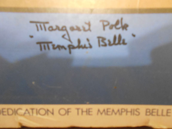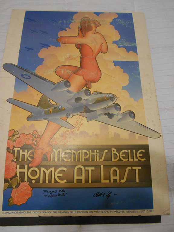 POLK, Ms. Margaret (1922-1990). Descendant of President James K. Polk. The bomber was named after Margaret who was called “Memphis Belle.” She was the sweetheart of Robert Morgan. The bomber was one of the first heavy bombers to complete 25 combat missions. In 1944 a documentary film was made and an additional film produced in Hollywood in 1990. Polk’s pinup in Esquire Magazine’s April 1941 issue was used for the nose art on the Memphis Belle. After the war, the bomber was purchased by the City of Memphis for $350.00. Color poster on board “The Memphis Belle Home At Last” commemorating the dedication of the Memphis Belle Pavilion, May 17, 1987. Hand signed along the bottom “Robert Morgan” and to his left hand signed “Margaret Polk, Memphis Belle” In good condition, with light scuffing in some areas, bottom right corner bumped but overall light wear, otherwise, quite colorful with fine signatures. A wonderful item for display...............$450.00