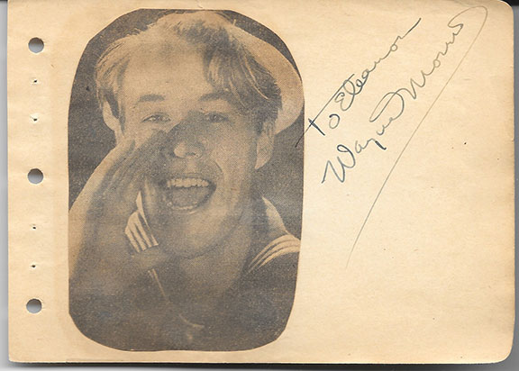 MORRIS, Wayne 1914-1959). American film and TV actor. Last of the B-Western stars. Decorated WWII fighter pilot, stationed on the aircraft carrier Essex. Shot down 7 Japanese aircraft and helped sink 5 vessels. Three of his planes were so heavily damaged by enemy fire they had to be dumped into the ocean as “unfit for duty.” Vintage album page inscribed: “To Eleanor Wayne Morris.” Affixed to the album page is a portrait of Morris as a sailor. Morris died at the young age of 45, His autographs are not common and missing from many collections of American Aces..............................$47.50