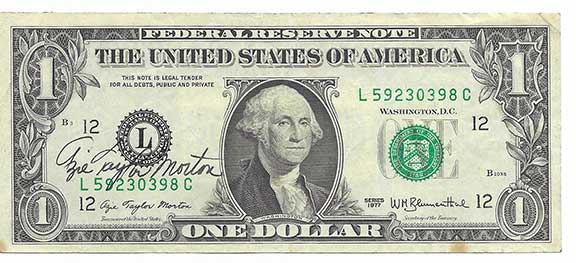 Appointed by President Carter. One dollar Federal Reserve Note hand signed in full by Morton just above her printed signature. Not a common autograph.......$85.00