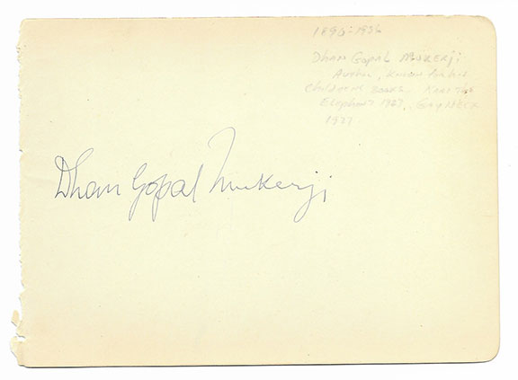 MUKERJI, Dhan Gopal (1890-1936) Author, known for his children’s books. Man of letters in the USA, he won the Newberry Medal in 1928. He was the first popular Indian to write in English. He killed himself at an early age by hanging. Scarce full signature in ink, on an album page...................$225.00
