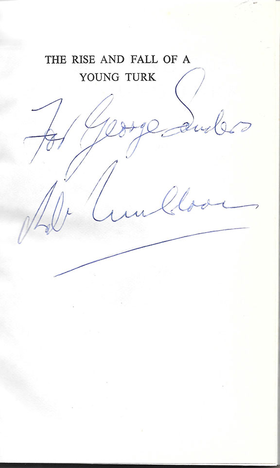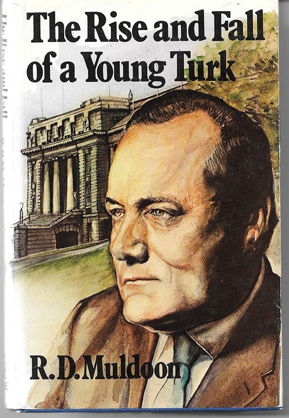MULDOON, R.D. (1921-1992). Thirty first Prime Minister of New Zealand (1975-1984). He introduced decimal currency to New Zealand. In 1984 he was only the second Prime Minister to receive knighthood while still in office. Leader of the National Party. His book: “The Rise and Fall of a Young Turk.” SA.H. & A.W. Reed Ltd, 1974 3rd impression. Hardcover, two hundred and three pages illustrated. Near fine copy with scarce dust jacket. Inscribed and signed on the half title page: “For George Sanders R.D. Muldoon.”......$60.00