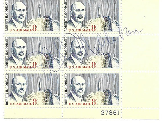 MULLIKEN, Robert  (1896-1986). American physicist and chemist.  He is responsible for the early development of molecular orbital theory. During WWII he worked on the Plutonium Project, part of the development of the atomic bomb. Awarded the Nobel Prize for Chemistry (1966).  Block of 6 U.S. 8 cent Air Mail stamps depicting a portrait of Robert Goddard and a rocket leaving the launch pad. Signed by Mulliken across the stamps. Unusual and fine..........................$47.50