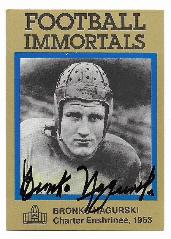 NAGURSKI, Bronko (1908-1990).Canadian-American professional football player. He was also a professional wrestler. He was an inaugural inductee into the Pro Football Hall of Fame (1963). Football Immortals card #89. Hand signed “Bronko Nagurski.” These cards are awfully hard to find bearing a genuine signature. Most signatures on these cards are forgeries. In very fine condition.............$175.00![]() |