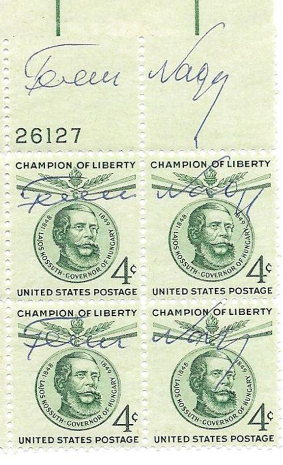 NAGY, Imre (1896-1958). Hungarian Communist Leader, Premier (1953-55). Forced out of office but recalled as premier (1956) of the new government in the Hungarian Revolution. Nagy’s second term ended when his non-Soviet backed government was brought down by the Soviet invasion. Nagy appealed to the West for help. When the revolution was crushed, he was arrested and went to trial. Nikita Khrushchev had Nagy executed. Scarce block of four U.S. 4 cent Champion of liberty stamps. Signed twice. Quite uncommon and desirable................SOLD
