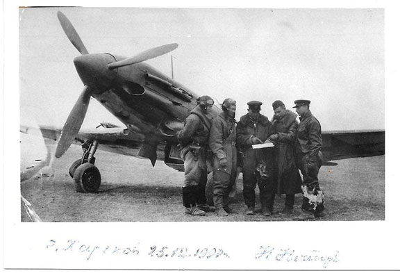 NAIDENOV, Nikolai (1918- ) Fighter Pilot, USSR. Ace with 27 Victories and 9 in a group. Hero of the U.S.S.R. Recipient of the Lenin Order, 2X Order of the Red Standart, 2X Order of the Patriotic War, Order of the A. Nevsky and Order of the Red Star. Photograph, B&W, 3.5”x5.5” of a Russian Fighter Plane with five pilots looking over some documents. Naidenov is the first from the left. Signed and dated by Naidenov on the lower white margin. Rare in signed photographs. In fine condition.................$225.00
