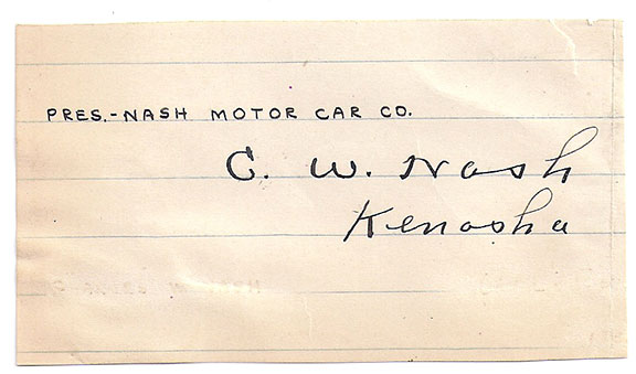 NASH, Charles W. (1864-1948). Automobile manufacturer. Farmer until 1891. Became an upholsterer with the Flint Road Cart Co. Within 10 years advanced to V/P of the company. Served as V/P of the Buick Motor Co. (1910-1916). Served as president of General Motors Corp. In 1916 he founded the Nash Motors Co. and was President and Chairman of the Board from 1916-1932. Very rare signature as “C.W. Nash” adding “Kenosha” in his hand. One of the scarcest auto manufacturer signatures of the dozen or so popularly collected........... $450.00
