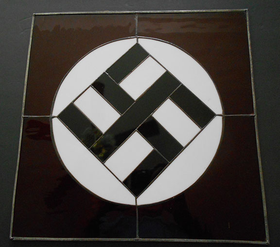 NAZI SWASTIKA, Leaded Stained Glass Window.  Measures 15”x15”, Black glass Swastika circled in white glass with a vibrant red glass background.  Most unusual and ready to be framed