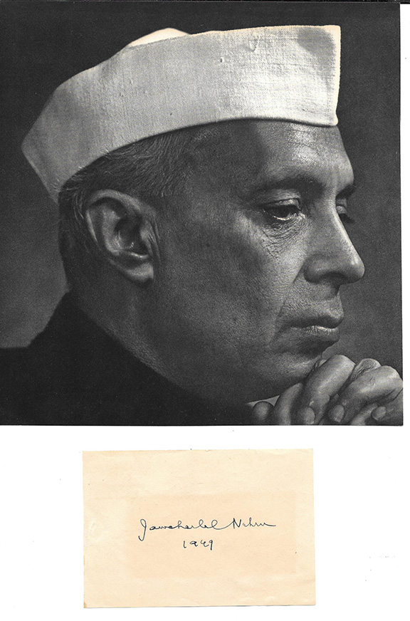 NEHRU, Jawaharlal  (1889-1964).  First Prime Minister of India. Three times President of Indian National Congress. Jailed between 1921-1934 for his Nationalist activities.  His daughter Indira Gandhi and his grandson Rajiv Gandhi became Prime Ministers and both were assassinated.  Fine signature of Nehru dated “1949” in his hand (as Prime Minister). Not common......................