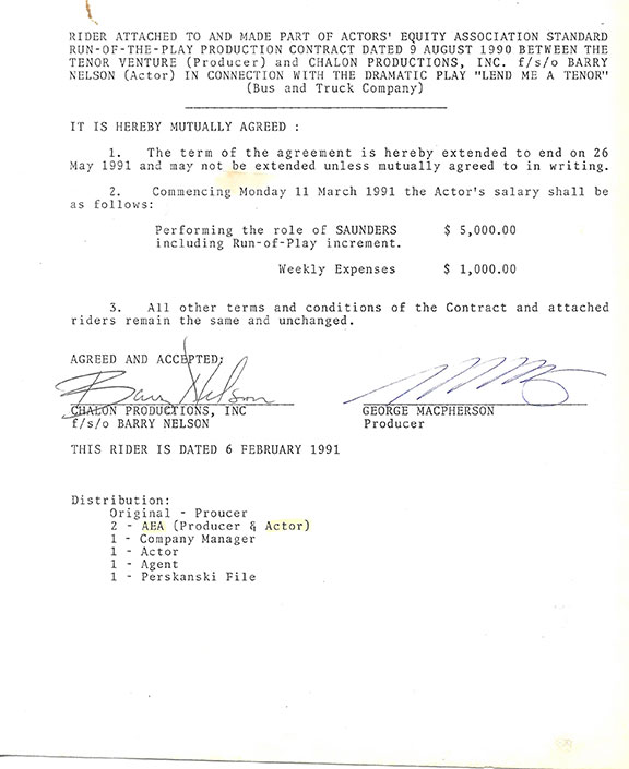 He played Bond in “Casino Royale” on October 21, 1954 along with Peter Lorre as Le Chiffre. Nelson as Bond foils the sinister Le Chiffre by beating him at baccarat. In the opening scene shots are fired at Bond and he responds that they weren’t asking for his autograph. Nelson appeared on Broadway and in many films including “Airport” and “The Shinning”. A Rider from a contract for the dramatic play “Lend Me A Tenor.” Barry Nelson was the actor. This agreement was extended and commencing Monday 11 March 1991 his salary shall be $5,000 for performing the role of Saunders and $1,000 for weekly expenses. Agreed and Accepted: Barry Nelson has signed his name. In addition, George MacPherson has signed his name as Producer. Genuine signatures of Barry Nelson are not common .............$125.00