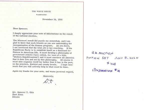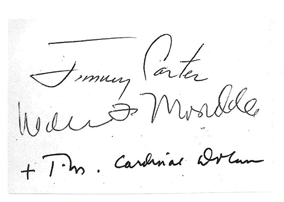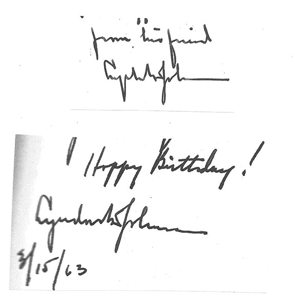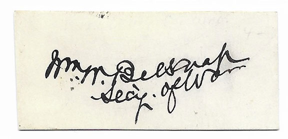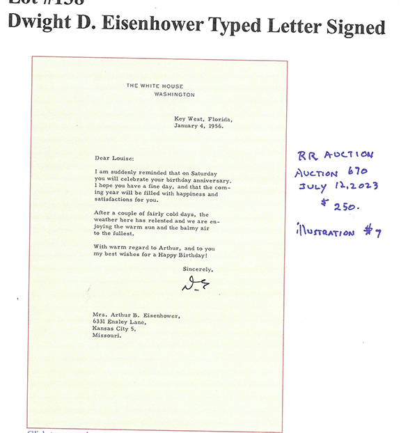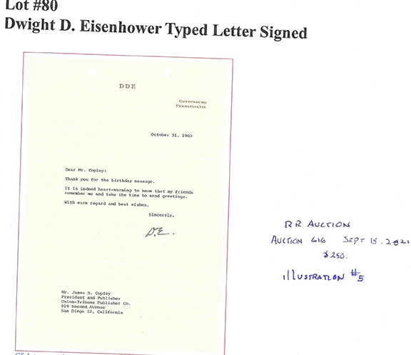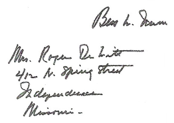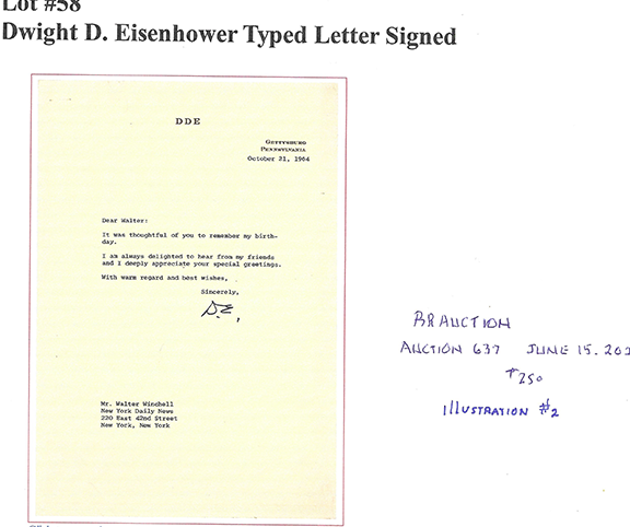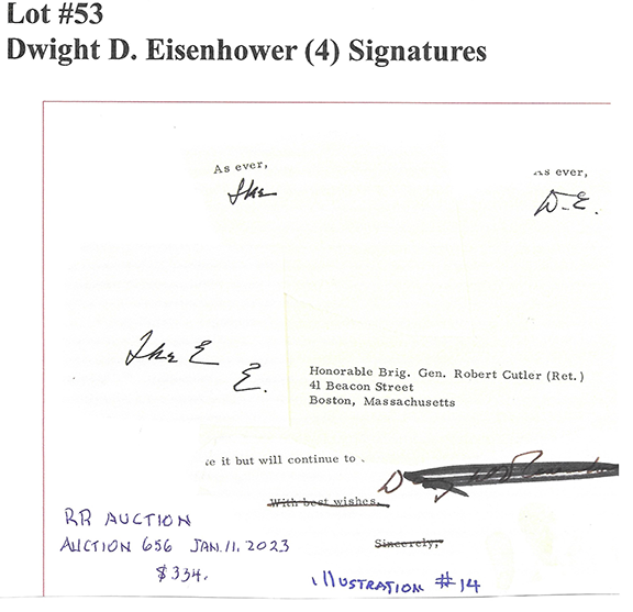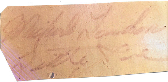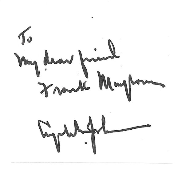 To an untrained eye, the second signature was authenticated by a seller of autographs who proudly advertises they are a member of the defunct UACC. The whole thing, including the three -word sentiment is VERY poorly executed. It’s amazing that someone would attach their name to this piece of garbage. The forger adding the three -word sentiment thought this would make the item an easy sell. WRONG! There’s something in this sentiment that is a dead give -away as to it being a forgery. I’ll tell you if you ask.