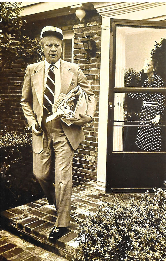 Now, running late, President Ford leaving his Virginia home for his First day in The White House. His suit still crumpled from the incident. Betty Ford behind the door smiling.