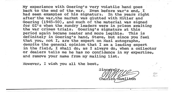 For this reason we have established a “Researched Autograph Opinion” service. This can be done in a timely fashion, usually within hours, and our opinion will be based on researching the questioned signature. The research will be done in our facility which maintains almost 50 years of collecting and filing exemplars in every field. On our premises, we also maintain one of the most significant autograph reference libraries in the hobby with books on autograph collecting dating back two centuries.