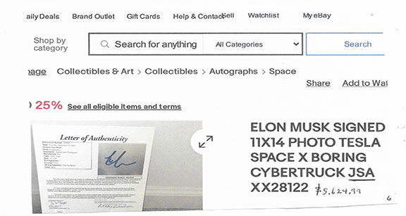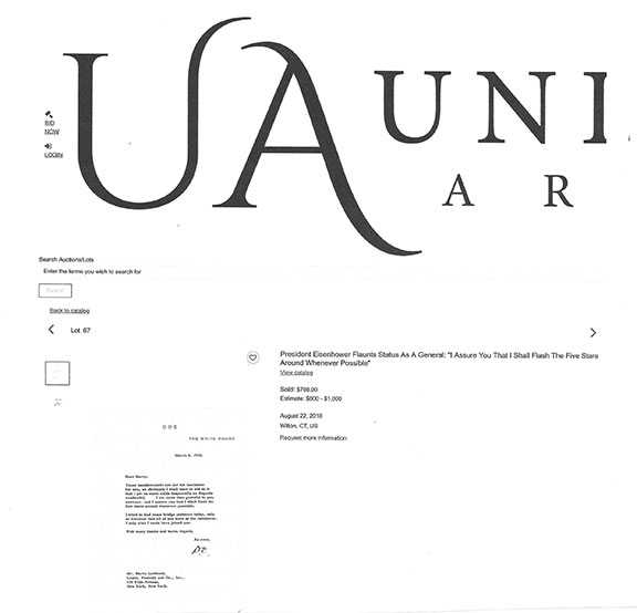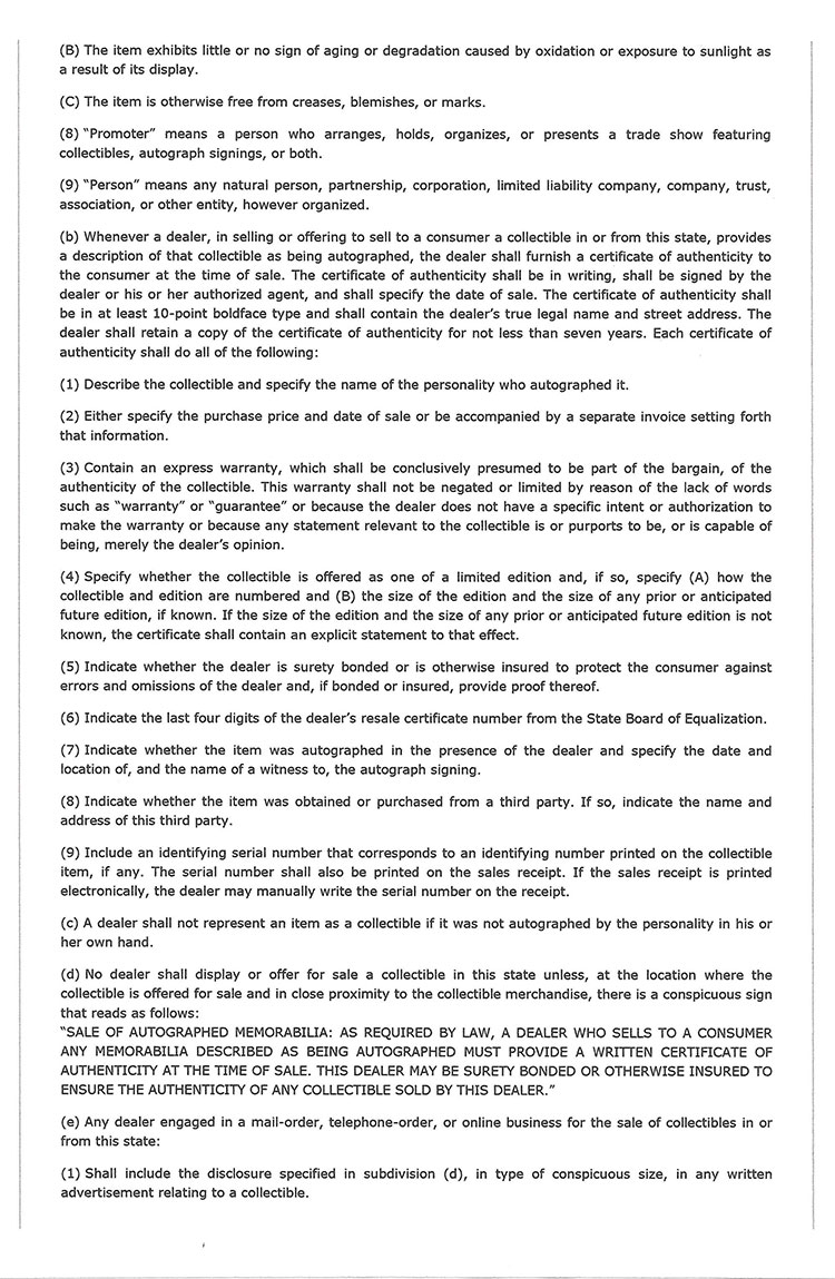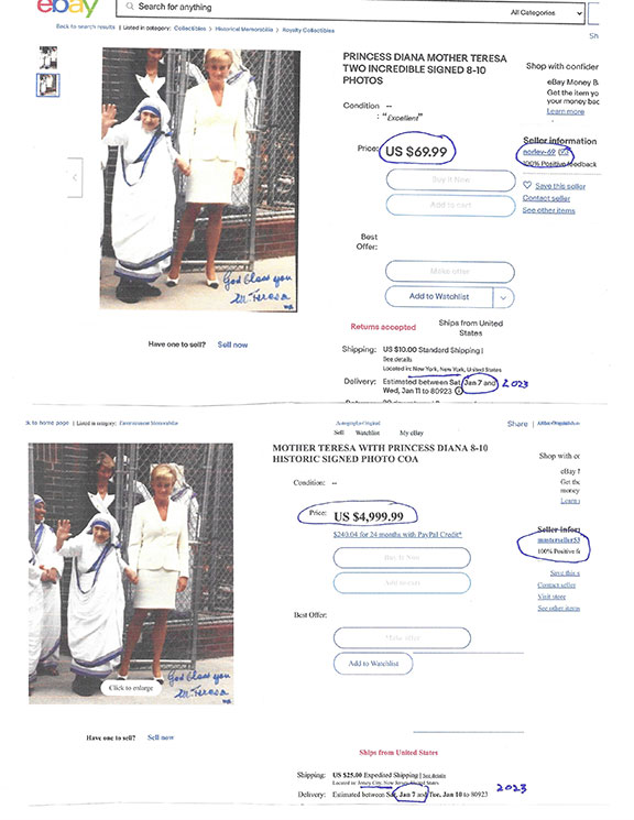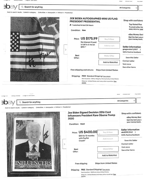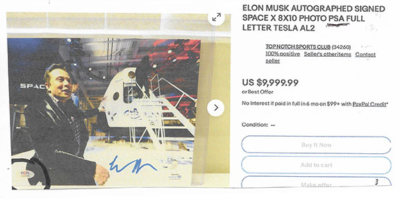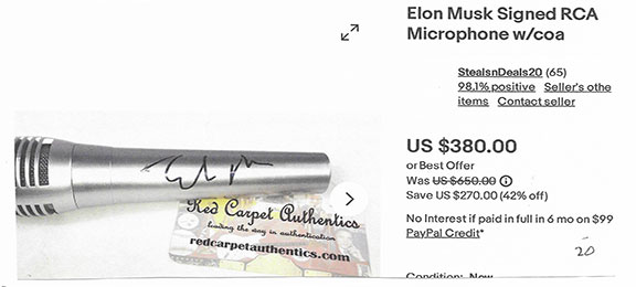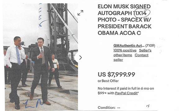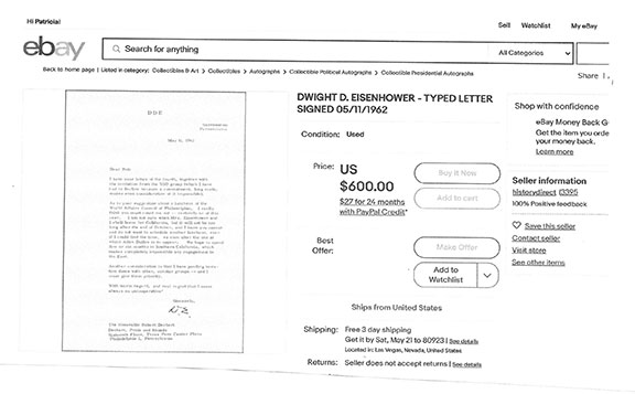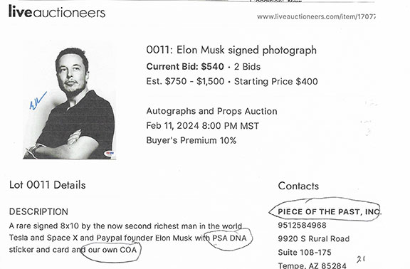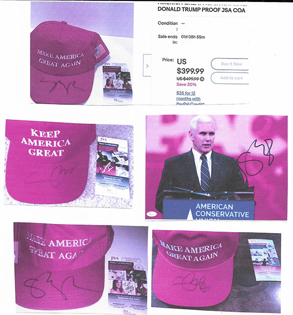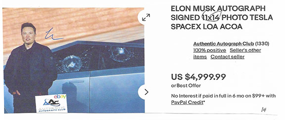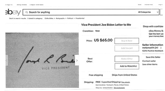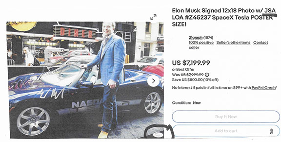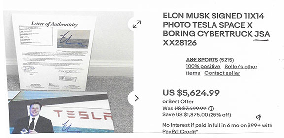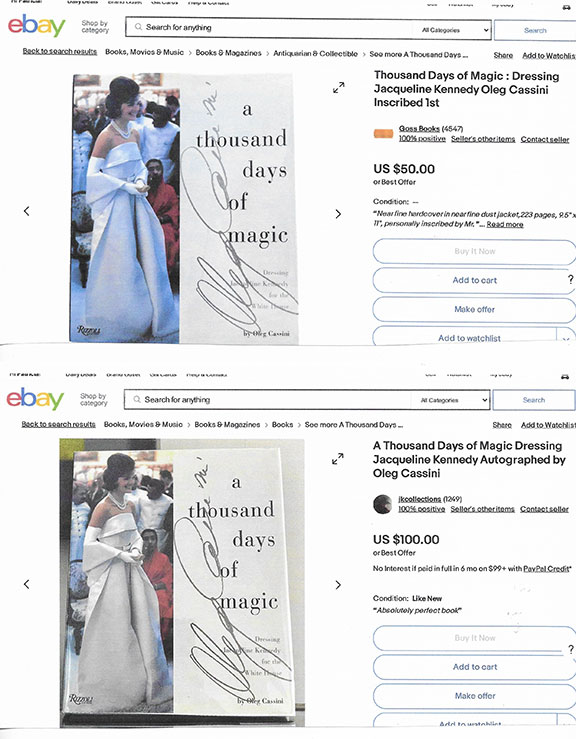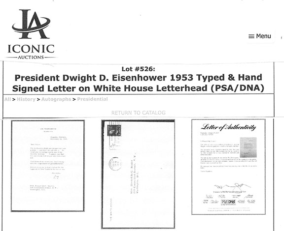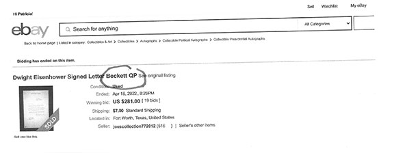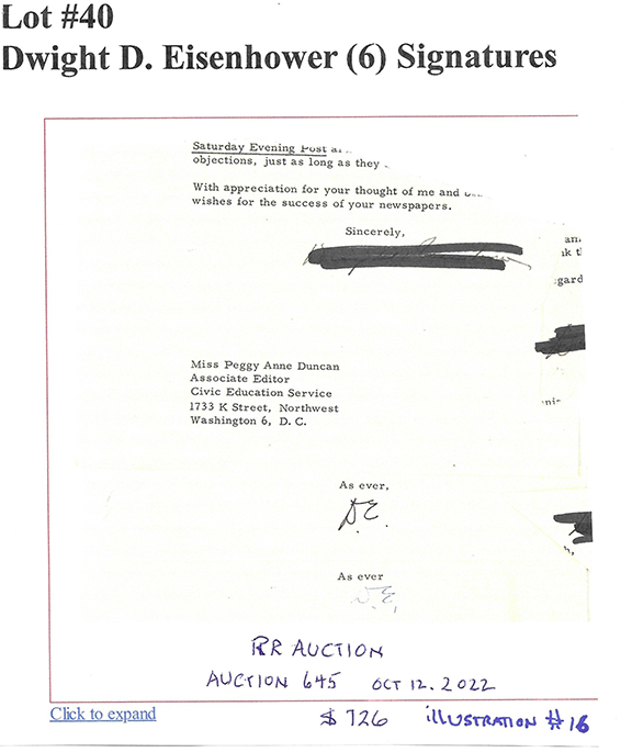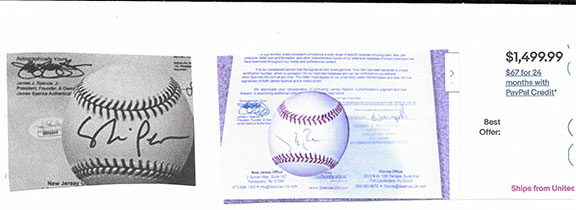 Along with this list and the numerous eBay examples is much food for thought here that can help protect you in transactions involving collectible autographs. Unfortunately, we now live in an environment that assaults us from every direction with highly questionable and/or manipulative crap, fraudulent activity and outright scams. If you're not continuously vigilant, it's only a matter of time before you'll get dinged. My favorite is an Empire Today TV commercial offering free flooring for additional rooms for only $50 each. Well, read the fine print at the bottom of the screen and you'll see this: "This offer does not include materials or installation." Anyway, Steve maintains an exceptionally informative resource here., and go here for a list of his additional publications.