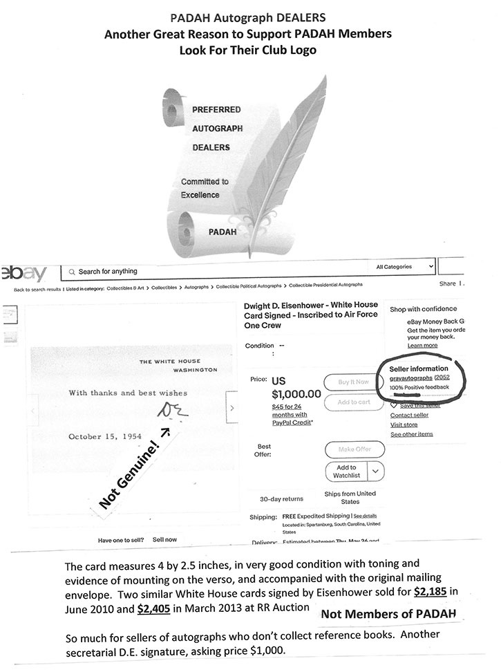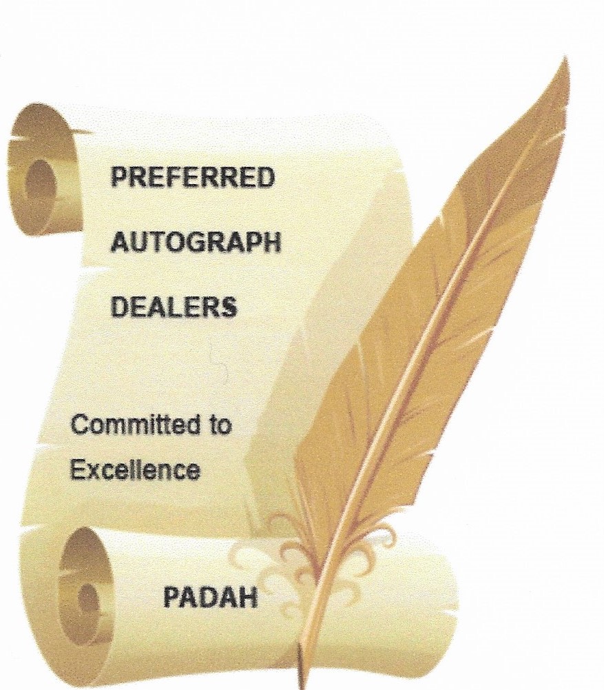 BEST WAY TO AVOID PURCHASING A FORGED AUTOGRAPH, purchase the item from one of the 70+ professional autograph dealers and auction houses. PADAH (Preferred Autograph Dealers and Auction Houses) IS THE LARGEST AUTOGRAPH DEALER ORGANIZATION IN THE WORLD. NOT ONE COMPLAINT HAS BEEN FILED AGAINST ONE IF ITS MEMBERS SINCE THE CLUB’S INCEPTION.