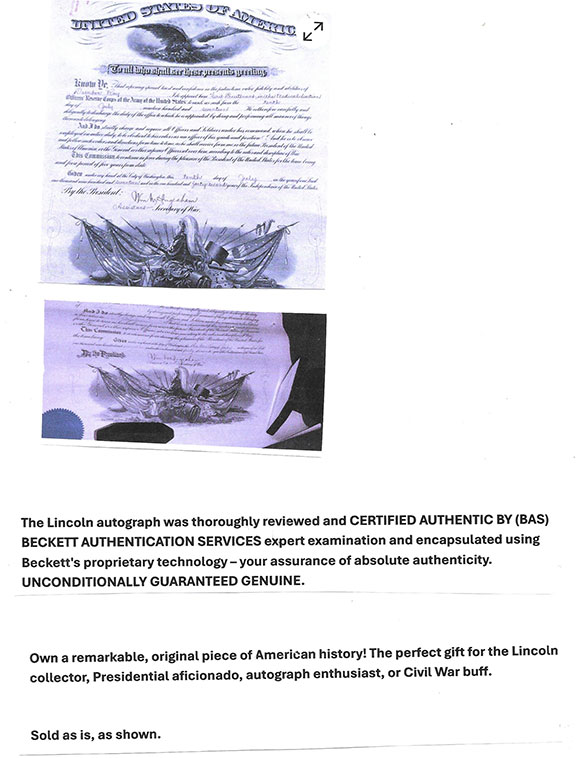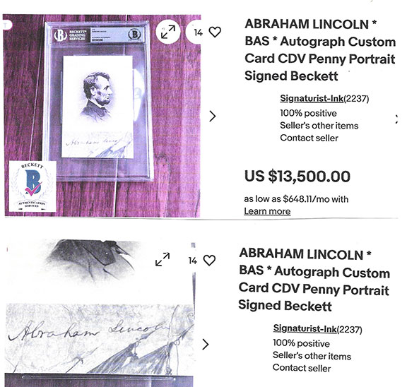Not surprisingly, the seller has found a company who claims to authenticate autographs to give this Lincoln signature their blessing.