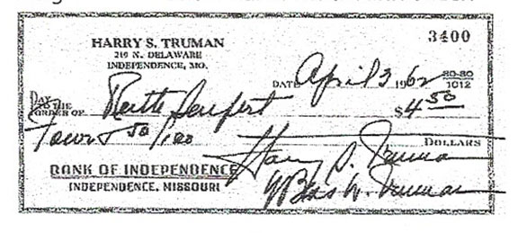 A check made payable for $10.00. It is my opinion that if you cut the check from "Ten" dollars down, it would fool 90% of the dealers The forger is that good! Problem is this half-wit with a pen is forging the style of Truman's signature from the mid to late 1950's on a 1909 item.