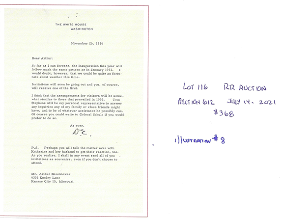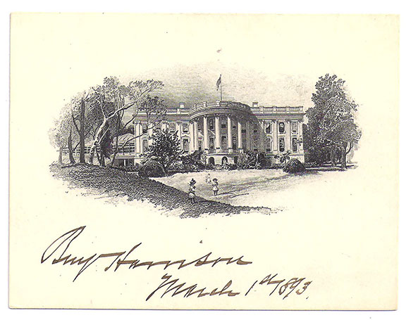 In the letter illustrated below, over three and one half years after his presidency, Benjamin Harrison writes on December 30, 1896: “...take great pleasure in complying with the request for an autograph. I happen to have left one of the autograph cards used at the White House, showing the south front...”