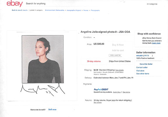 The takeaway lesson is not to put blind faith in anybody - and this is the basic lesson in Stephen Koschal's book. What I like about Steve's books are their specific focus, and in this one he zeroes in on Angelina Joli, offering numerous examples of signed eBay items presented as authentic when they are obviously not, including forgeries, secretarial's, autopen signatures and more, many of them with "comforting" COA's from so-called legitimate authenticating services. You may ask, is eBay a reliable venue for purchasing autographed items? The short answer is no, of course not, which isn't to say that genuine things can't be had if one follows a common-sense protocol. More about this some other time.