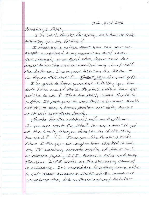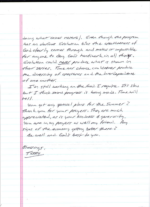 NICHOLS, Terry (1955- ). Serving a life sentence for his role in the Oklahoma City bombing. He was an accomplice to Timothy McVeigh who is a convicted bomber and mass murderer who claimed the lives of 168 people. Nichols was married to a Philippine woman (mail order bride) she was pregnant with another man’s child. The child died at the age of 2 when it suffocated in a plastic bag while Nichols was babysitting him. In 1992 he renounced his US citizenship. On April 19, 1995 Nichols/McVeigh bombed the Federal Building in Oklahoma City. Autograph letter signed, U.S. Penitentiary Max, Florence, Colorado. 22 April 2010, both sides of one legal size page. Nichols sends thanks for a gift of money, talks about Toyota cars, visiting, the Alamo and about the Emily Morgan Hotel being haunted. He continues to talk about TV shows that he watches including CSI Forensic Files. He talks in length about evolution and so much more including “is the economy getting any better?” Signed “Terry.”...............................$175.00