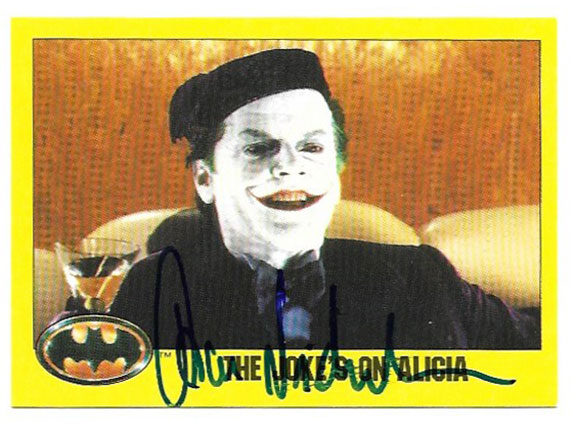 NICHOLSON, Jack  (1937-   )  Extremely popular American actor. Three-time Oscar winner. DC collector’s card (1989). “The Joke’s on Alicia!”  Jack Nicholson as The Joker. Signed with a blue ink Sharpie pen, a nice vintage signature. In fine condition........