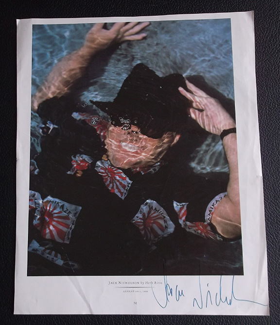 NICHOLSON, Jack (1937- ) American actor, film director, producer and writer. Winner of the Academy Award (1975, 1994 & 1997). Most unusual oversized, appx.11”x14” color portrait of Nicholson wearing a kamikaze shirt and lying underwater, taken by Herb Ritts, August 14, 1986. Boldly signed on the lower white margin by Jack Nicholson. In very good condition.................SOLD![]() |