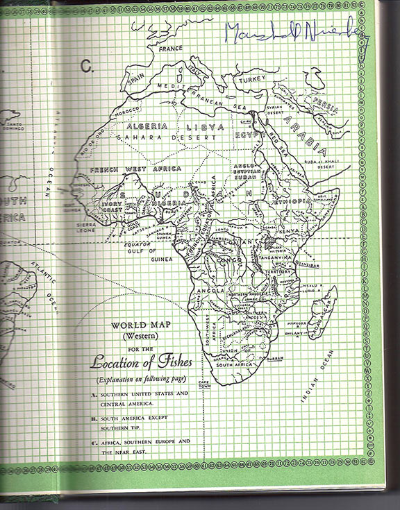 NIRENBERG, Marshall (1927-2010). Jewish, American biochemist and geneticist. Shared the Nobel Prize in 1968 for Physiology or Medicine for breaking the genetic code. He was awarded the National Medal of Science (1964) and the National Medal of Honor (1968) by President Lyndon B. Johnson. Book from his personal library. Exotic Aquarium Fishes. Aquariums Publishing Incorporated, 1964, 543 pages, heavily illustrated, many with color plates. Signed on the front free endpaper “Marshall Nirenberg”. Books from the libraries of Nobel Prize recipients are seldom offered and this example is in fine condition........................ $65.00