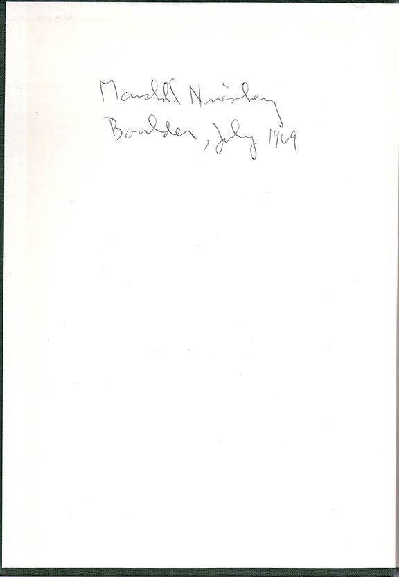 NIRENBERG, Marshall (1927-2010). Jewish, American biochemist and geneticist. Shared the Nobel Prize in 1968 for Physiology or Medicine for breaking the genetic code. He was awarded the National Medal of Science (1964) and the National Medal of Honor (1968) by President Lyndon B. Johnson. Book from his personal library. Thymidine Metabolism and Cell Kinetics. North Holland Publishing Co. Amsterdam, 1967. 259 pages, illustrated. Signed inside front cover: “Marshall Nirenberg, Boulder, July 1969”. This book, in many places is underlined By Nirenberg and several pages have his lengthy notes in the margins. A well read book by Marshall Nirenberg. Books from the libraries of Nobel Prize recipients are seldom offered and this example is in fine condition........................ $65.00