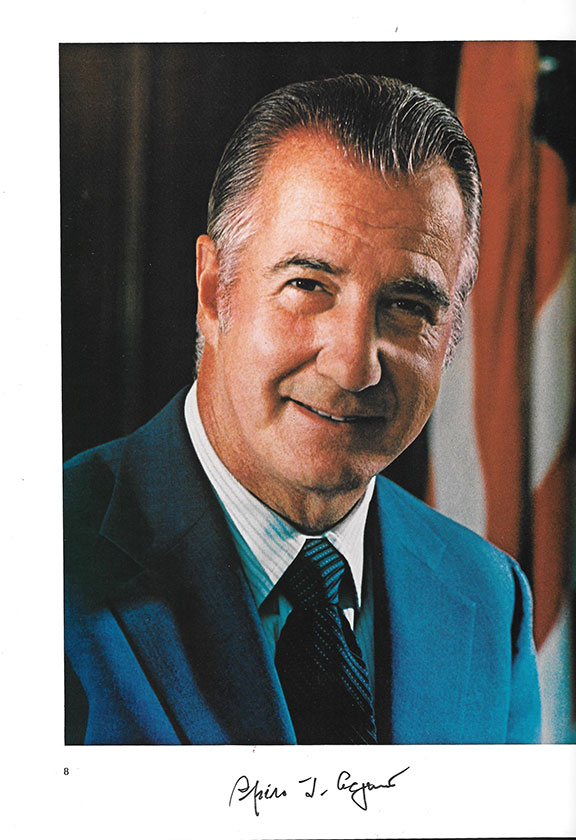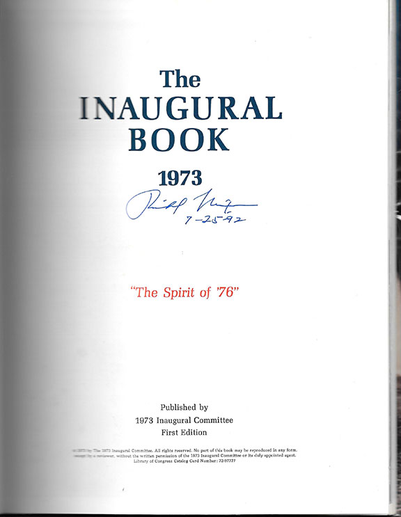 AGNEW, Spiro (1918-1996) 39th Vice-President of the United States and the second V/P to resign the office due to criminal charges of tax evasion. “The Inaugural Book, 1973”. First Edition Published by the 1973 Inaugural Committee. Ninety-six pages, full page color illustrations. Richard Nixon has signed the title page and dated his signature “7-25-92”. On page 8, Spiro Agnew has signed his name under his full page color portrait. This was their last term before both resigned their office. Agnew resigned on Oct. 10, 1973 and Nixon resigned on Aug. 9, 1974. In very good condition with repaired dust jacket protected by a protection cover. This is the first book of this title we have handled signed by both. A modern rarity.................... $450.00