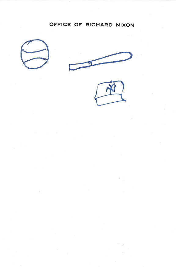 Page from his personal note pad where Nixon has drawn a baseball, baseball bat and a N.Y. Yankees Baseball Cap. This was done “in person” in Nixon’s New Jersey office for Stephen Koschal. Koschal was/is working on a book “Presidential Boredom, Doodles from Our Chief Executives”. In fine condition and very rare........................675.00