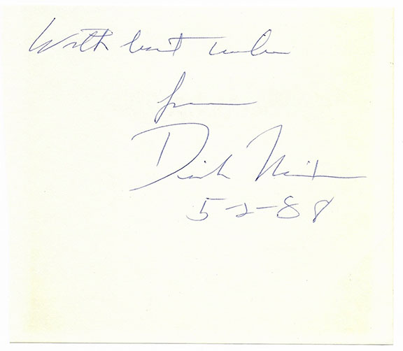 NIXON, Richard (1913-1994). 37th president of the United States. First President to resign the Office of the Presidency. Large slip most likely removed from one of his books with a four-word sentiment, signed as “Dick Nixon” and dated 5/2/88. In excellent condition........................$165.00 |