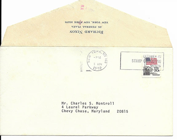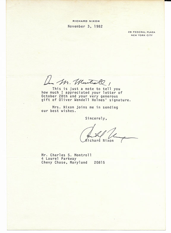 NIXON, Richard (1913-1994). Thirty seventh President of the United States. First president to resign from the office of the presidency. Typed letter signed, one page on his name engraved letterhead. November 3, 1982 to Charles S, Montroll. Unusual, Dear Mr. Montroll is written in Nixon’s hand. Nixon thanks Montroll for his kind letter and a gift of Oliver Wendell Holmes’ signature. Choice signature of Richard Nixon, fine condition.......................SOLD ![]() ![]() |