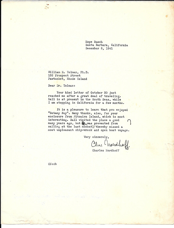 NORDHOFF, Charles (1887-1947). Served as a pilot in WWI with the French Air Forces and then in the U.S. Army Air Corps. He was a WWI Ace with 6 recorded victories. Together with James Norman Hall they wrote “Lafayette Flying Corps” (1920) and “Mutiny On The Bounty” (1932). Typed letter signed, one page, 12/8/1941. Choice content Nordhoff writes in part: “...Hall is at present in the south Seas, while I am stopping in California for a few months. It is a pleasure that you enjoyed ‘Botany Bay’. Many thanks also, for your enclosure of Pitcarin Island, which is most interesting. Hall visited the place a good many years ago, but he was prevented from sailing at the last moment, thereby missed a most unpleasant ship-wreck and open boat voyage...” Signed Chas. Nordhoff. Two corrections in his hand. A fine example......... $195.00