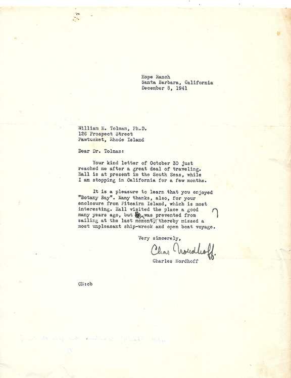 NORDOFF, Charles (1887-1947). Served as a pilot in WW1 French Air Force and then in the U.S. Army Air Corps. Wrote with James Norman Hall “Lafayette Flying Corps (1920) and “Mutiny On The Bounty” (1932). Typed letter signed, one page, Hope Ranch, Santa Barbara, Ca, December 8, 1941. Mentions that Hall is at present in the South Seas also mentions his book “Botany Bay” and “Pitcairn Island”. Nordoff continues: “ ...It is a pleasure to learn that you enjoyed “Botany Bay”. Many thanks, also, for your enclosure from Pitcairn Island, which is most interesting. Hall visited the place a good many years ago, but was prevented from sailing at the last moment & thereby missed a most unpleasant ship-wreck and open boat voyage.” Bold signature with three corrections in his hand........SOLD