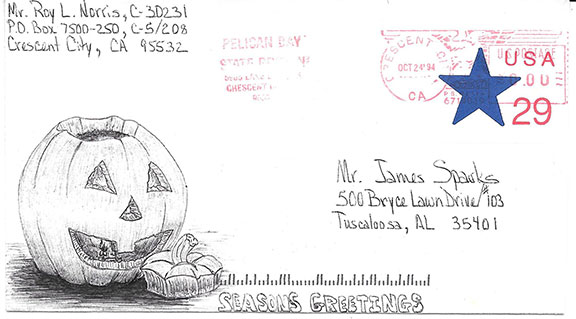 Norris, Roy (1948- ). American serial killer who with his partner Lawrence Bittaker were responsible for torturing, raping and killing five girls with tools normally found inside a household tool box. Known as “The tool Box Killer.” They killed the women in their van known as the “Murder Machine.” Envelope hand addressed. On the top left corner Norris has signed his name, added his prison number and return address. Tastefully done is an original drawing of a smiling pumpkin and the words “Seasons Greetings” by the hand of Norris. Skillfully done prison art..............................$125.00