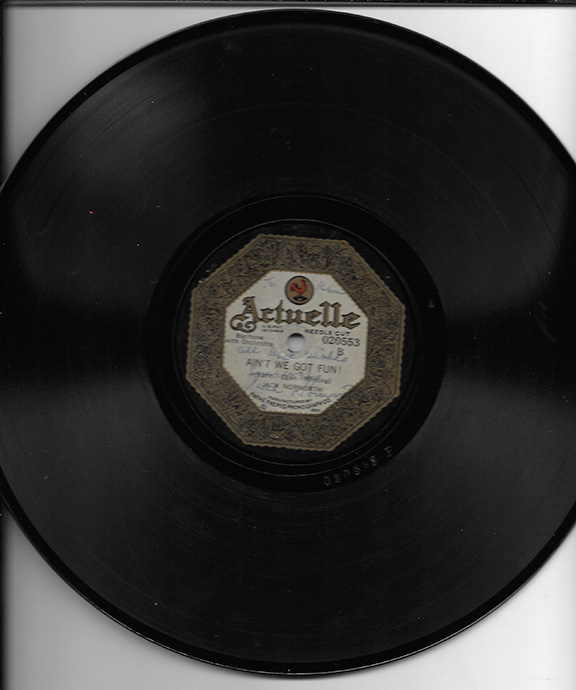 Signed by the author of “Take me Out To The Ball Game” Norworth wrote over 2,500 songs including “Aint’ We Got Fun” and a huge hit “Shine On, Harvest Moon”. Norworth was inducted into the Songwriters Hall of Fame. When he attended his first major League Baseball game on June 27, 1940, the League presented Norworth with a Gold Lifetime Ballpark Pass. A 78 Record of his big hit “Ain’t We Got Fun” copyright 1920. Inscribed and signed on the label: “To Ken, all best wishes, Jack Norworth.” In very good condition in the original protective jacket. RARE................................ $475.00 ![]() |