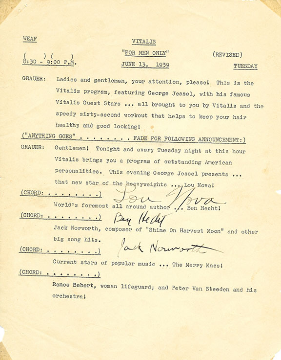 NOVA, Lou (1913-1991) American boxed and actor. He was the U.S. Amateur Boxing Champion in 1935. After turning pro, he remained undefeated in his first 22 matches. As an actor, he appeared in over 20 films. HECHT, Ben (1894-1964) American screen writer, director, producer, and novelist. Wrote 35 books. Cover page for the radio show on WEAF. Vitalis For Men Only June 13, 1939. With the Vitalis guest stars named above. Signed by all three next to their parts in the program. A full signature of Jack Norworth is not easily found. He usually signed most items with his first name only. Corners taped; bottom corners chipped otherwise in V/G condition.............................SOLD ![]() |