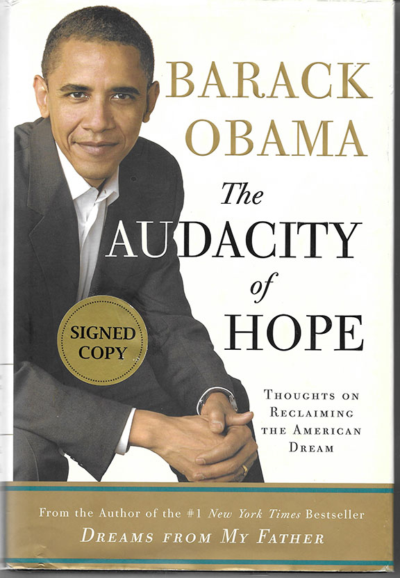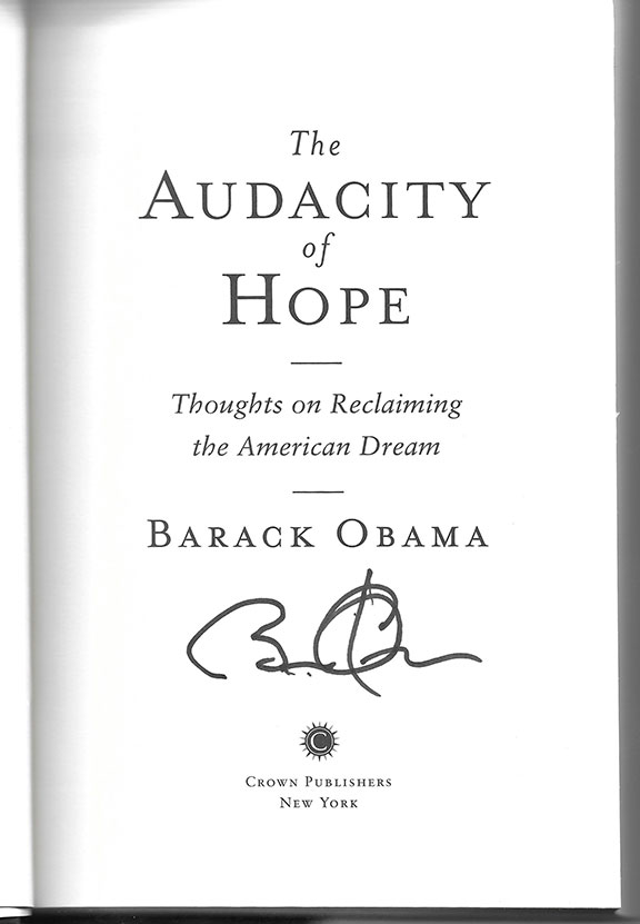 OBAMA, Barack (1961- ) 44th President of the United States (2009-2017). First African American President of the United States. His book: “Barack Obama The Audacity of Hope.” Crown Publishing, 20006, First Edition, First printing, so stated, 376 pages. Boldly signed on the title page. A fine copy with the dust jacket. Some dealers are selling this book as high as $4,020.00. Signed first editions of this title are becoming a bit difficult to find.......................$495.00 |