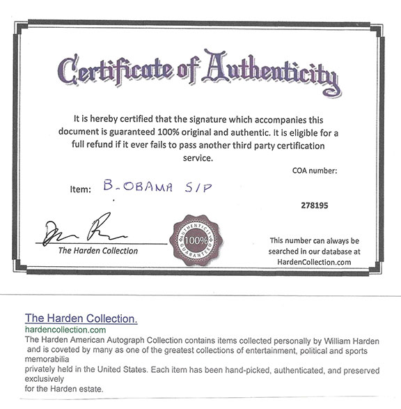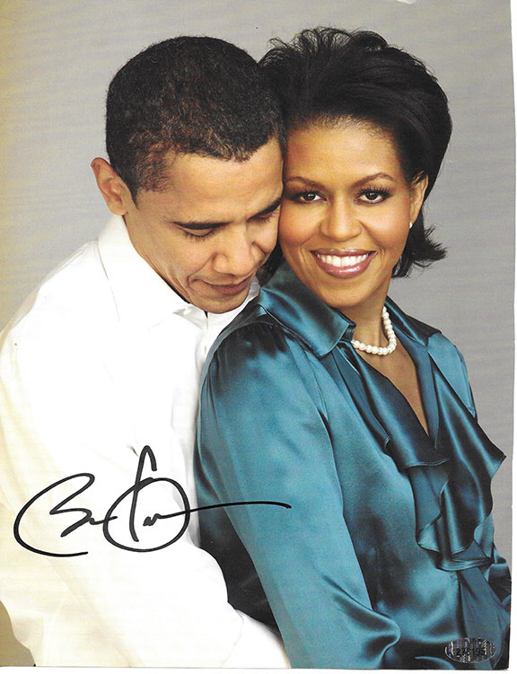 OBAMA, Barack (1961- ) 44th President of the United States (2009-2017). Wonderful color portrait of Barack and Michelle Obama smiling during a touching moment. Measures appx: 7.5”x10” very boldly signed by Barack Obama. Comes with a COA from the Harden Collection. Some imbecile affixed an authentication sticker on the bottom left corner of the portrait, otherwise a very attractive example.......................SOLD |