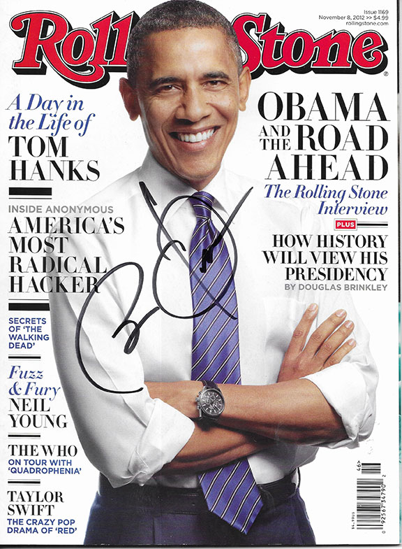 OBAMA, Barack (1961- ) 44th President of the United States (2009-2017). First African American President of the United States. Rolling Stones magazine, issue 1169, November 2012, while he was president full length color pose of Obama smiling. Inside is his interview. Signed very boldly using a Sharpie black ink pen. In very fine condition.....................$295.00![]() |