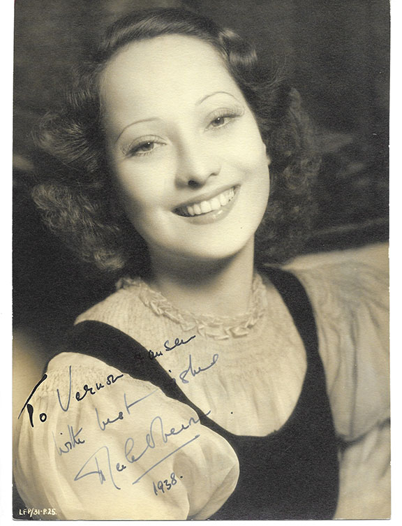 OBERON, Merle (1911-1979). Born in Bombay British India to a 12 year old mother. Nominated for Academy Award, Best actress The Dark Angel (1935). Appeared in over 50 films. During 19937 she was involved in a traffic collision causing facial injury. Very scarce vintage photograph, measuring 7”x9” head and shoulders pose smiling. Inscribed and signed: “To Vernon Hansen with best wishes Merle Oberon 1938.” In fine condition...........................$250.00![]() |