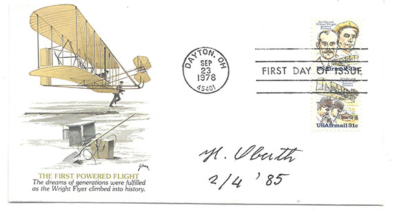 OBERTH, Hermann (1894-1989) German pioneer rocket developer who in 1920 foresaw manned space flight. His research led to the German V-2 rocket/guided missile project. One of Oberth’s young assistants was Wernher Von Braun. First Day Cover commemorating The First Powered Flight. Fine color cachet of the flight, the Wright Flyer climbs into History. Affixed to this cover are two different Wright Brothers, U.S. Air mail, 31 cent postage stamps. Cancelled Dayton, OH Sep 23, 1978. Fine dated signature: “H.Oberth 2/4’ 85.” In excellent condition.................$225.00
