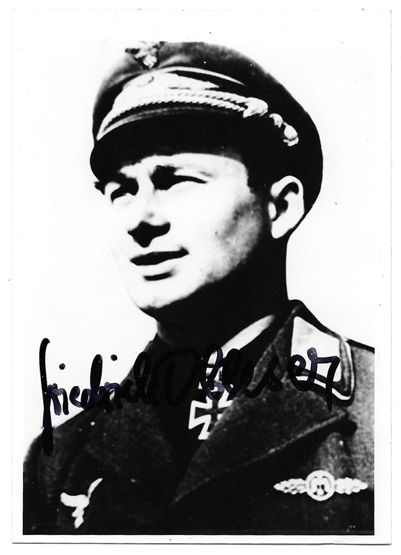 OBLESSER, Oberleutnant Friedrich (1923-2004). German fighter pilot in the Luftwaffe during WWII. Flew with the JG-52. Ace credited with 127 victories. Awarded the Knight’s Cross of the Iron Cross. Photograph, 4”x6”, B&W, head & shoulders pose in uniform. Signed with his full signature...................... $75.00 |