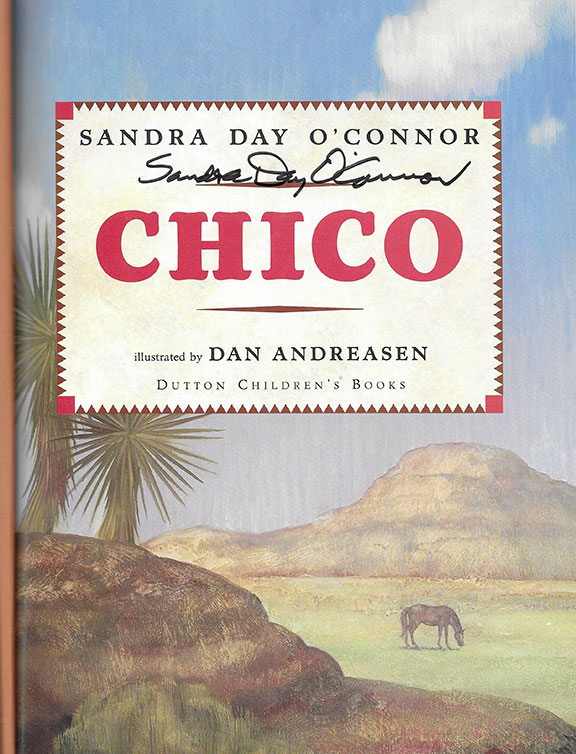 O’CONNOR, Sandra Day (1930- ) First female Associate Justice of the U.S. Supreme Court. Nominated by President Ronald Regan. Some publications ranked her as the most powerful woman in the world. Her children’s book CHICO, A True Story from the Childhood of the First Woman Supreme Court Justice. Dutton Children’s Books, 2005, First Edition, later printing. Color illustrations by Dan Andreasen, folio. Genuinely signed in full on the title page. Many items offered on the market are signed for her by the Autopen machine. In fine condition with the scarce dust jacket with clear protective cover....................SOLD
