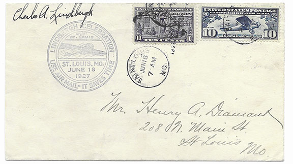 LINDBERGH, Charles A. (1902-1974). American aviator, military officer, author, and inventor. On May 20-21, 1927 he flew the first solo nonstop flight from new York to Paris. He received the Medal of Honor from President Calvin Coolidge. In 1938 Hermann Goring presented Lindbergh a medal on behalf of Adolf Hitler. Later, Lindbergh refused to return the medal. Lindbergh witnessed the launch of Apollo II. While married he had seven children with two German ladies and his private secretary. Rare cover with a cachet commemorating Lindbergh Celebration, Use Air Mail-It Saves Time, St. Louis, MO. June 18,1927. On this day St. Louis held a huge parade for Lindbergh. Two U.S. 10 cent postage stamps cancelled Saint Louis Jun 18, 1927. On the verso are two-time stamps for Jun 18. Top left corner of this cover, Lindbergh has boldly signed his name with his scarcer and very desirable full signature. Lindbergh signed this cover just 7 days after returning from Paris. In fine condition.........$1650.00