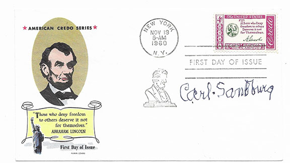 SANDBURG, Carl (1878-1967). American writer and poet. In 1939 he won a Pulitzer Prize for a four-volume set of books on Abraham Lincoln. First Day Cover commemorating Abraham Lincoln with a color cachet of Lincoln and one of his quotes. Four cent Abraham Lincoln U.S. postage stamp cancelled First Day of Issue, New York, NOV 19, 1960. Bold old age signature of Carl Sandburg In fine condition.....................$150.00![]() |