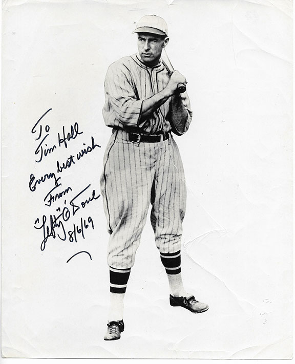 O’DOUL, Lefty (1887-12/07/1969) American baseball player, known as a pitcher and one of the game’s best top hitters. He is a baseball legend and coach. He won two batting titles and hit .349 lifetime. He is the fourth highest all-time behind only Cobb, Hornsby, and Joe Jackson. His first game was on April 29/1919 and his last Sept.30/1934. He played with the 1919, 20 & 22 N.Y. Yankees and the 1923 Red Sox and with the Dodgers and Giants. O’Doul made more than 20 trips to Japan as a player, coach, and advisor. He was elected to the Japanese Hall of Fame in 2022. Very scarce 8”x10” photograph, full length in uniform ready to swing his bat. Beautifully and very boldly inscribed, signed and dated (just four months before his passing) “To Tim Hall Every best wish From ‘Lefty’ O’Doul 8/6/69.” A few minor creases otherwise in very good condition. This is the first full size photo of O’Doul we have handled in over 50 years....................$950.00
