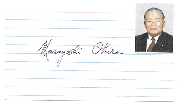 OHIRA, Masayoshi (1910-1980). Foreign Minister 1962-1964, 1972-1974, Minister of Finance 1974-1976, Prime Minister of Japan 1978-1980, died in office.  Uncommon full ink signature on a lined 3”x5” card.................. $135.00